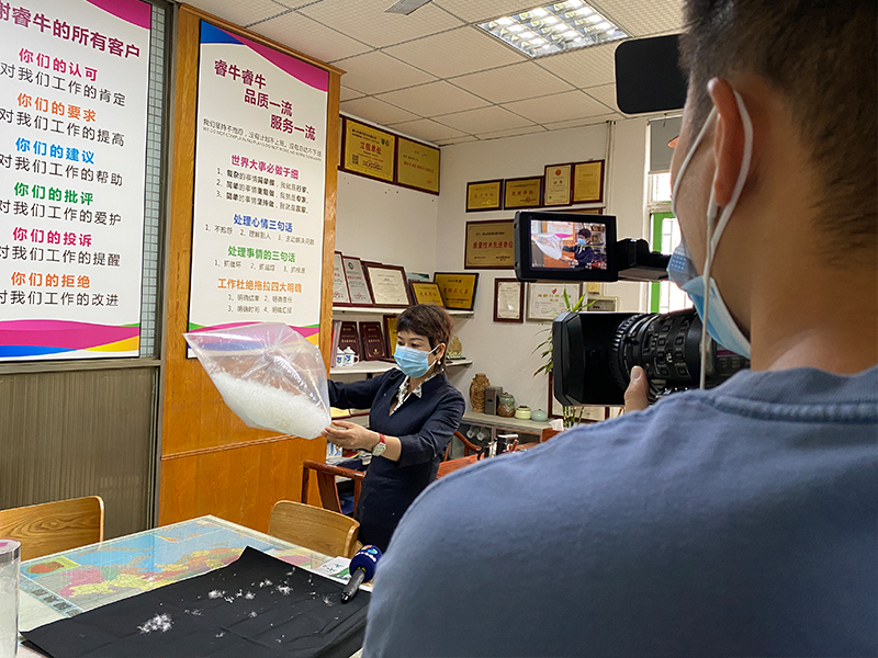 媒體記者參觀了我廠車間、沖絨房,并采訪了睿牛總經理--歐陽月華女士。