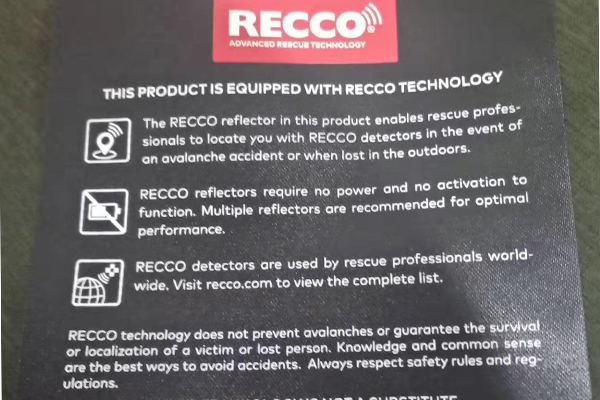 思諾華服飾&睿牛制衣是一家20年主營沖鋒衣、滑雪服的定制生產廠家,20年制作研究戶外服裝,戶外服裝的制作工藝、功能性都要求嚴格,對于這一RECCO,它是雪崩救援系統的簡稱,RECCO 是用于定位雪崩受難者的電子系統。