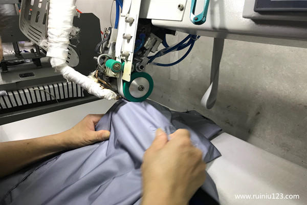 像是沖鋒衣的縫線會破壞防水效果,所以在沖鋒衣的全件各縫接處里布那里都會有壓膠層的。請看一下示意圖:【注:一下是思諾華工廠真實生產圖片】