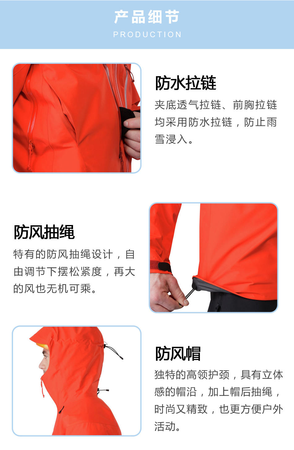 • 防風帽:獨特的高領護頸,具有立體感的帽沿,加上帽后抽繩,時尚又精致,更方便戶外活動,專業沖鋒衣貼牌代工