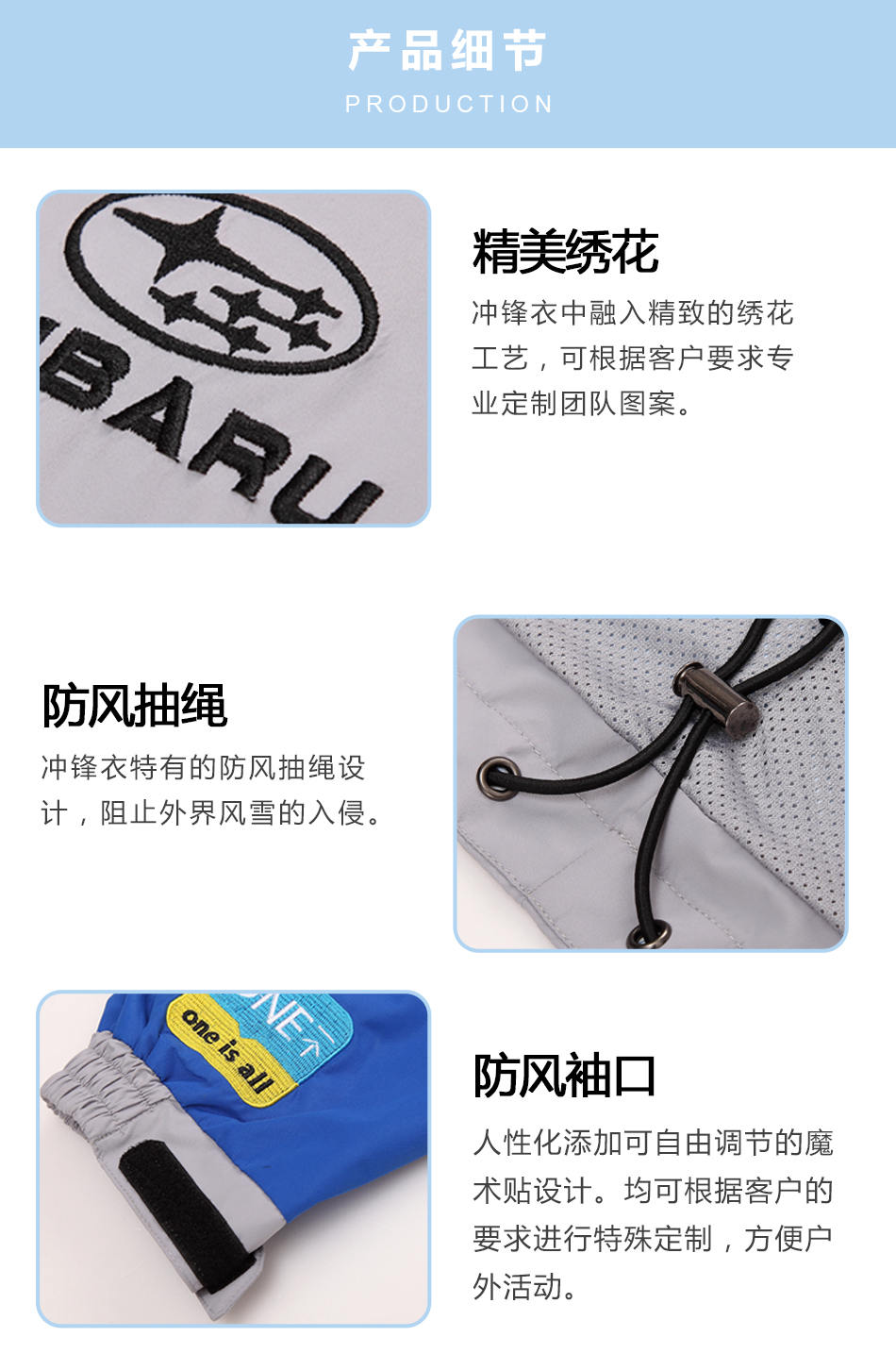 精美繡花:沖鋒衣中融入精致的繡花工藝,可根據客戶要求專業定制沖鋒衣團隊圖案。