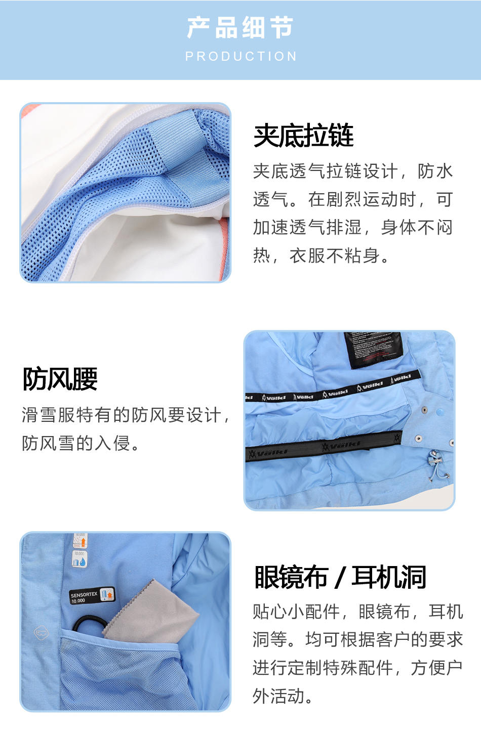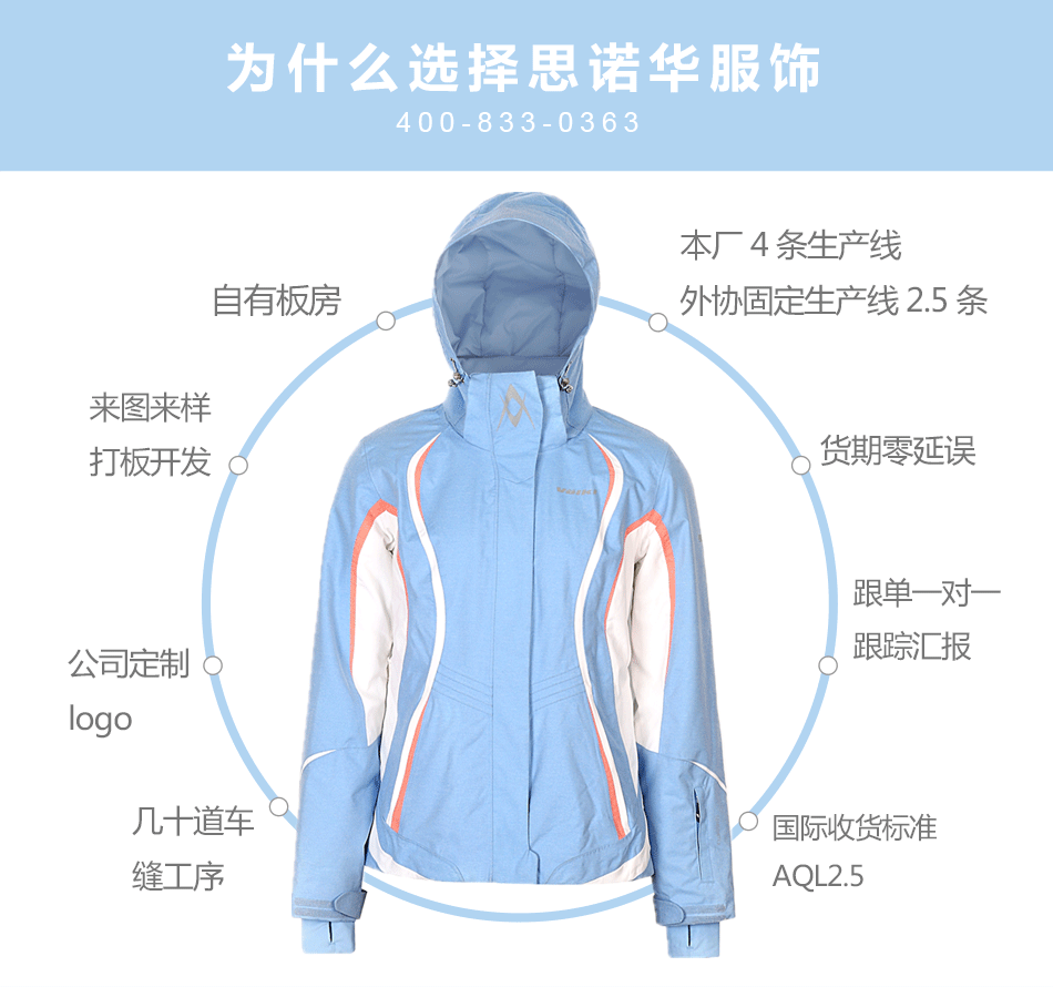 防水拉鏈采用無縫壓膠防水拉鏈激光熱封工藝貼合,面料采用進口防水透氣涂層膜,使防水透氣膜與面料完美結合??筛鶕蛻粜枨笸瓿?a href="http://www.itocean.com.cn/design/" target="_self">戶外沖鋒衣定制。