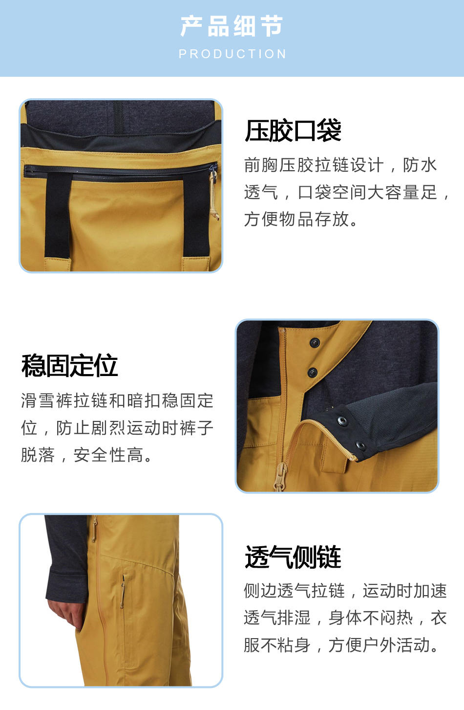 穩固定位滑雪褲加工的拉鏈和暗扣穩固定位,防止劇烈運動時褲子脫落,安全性高。